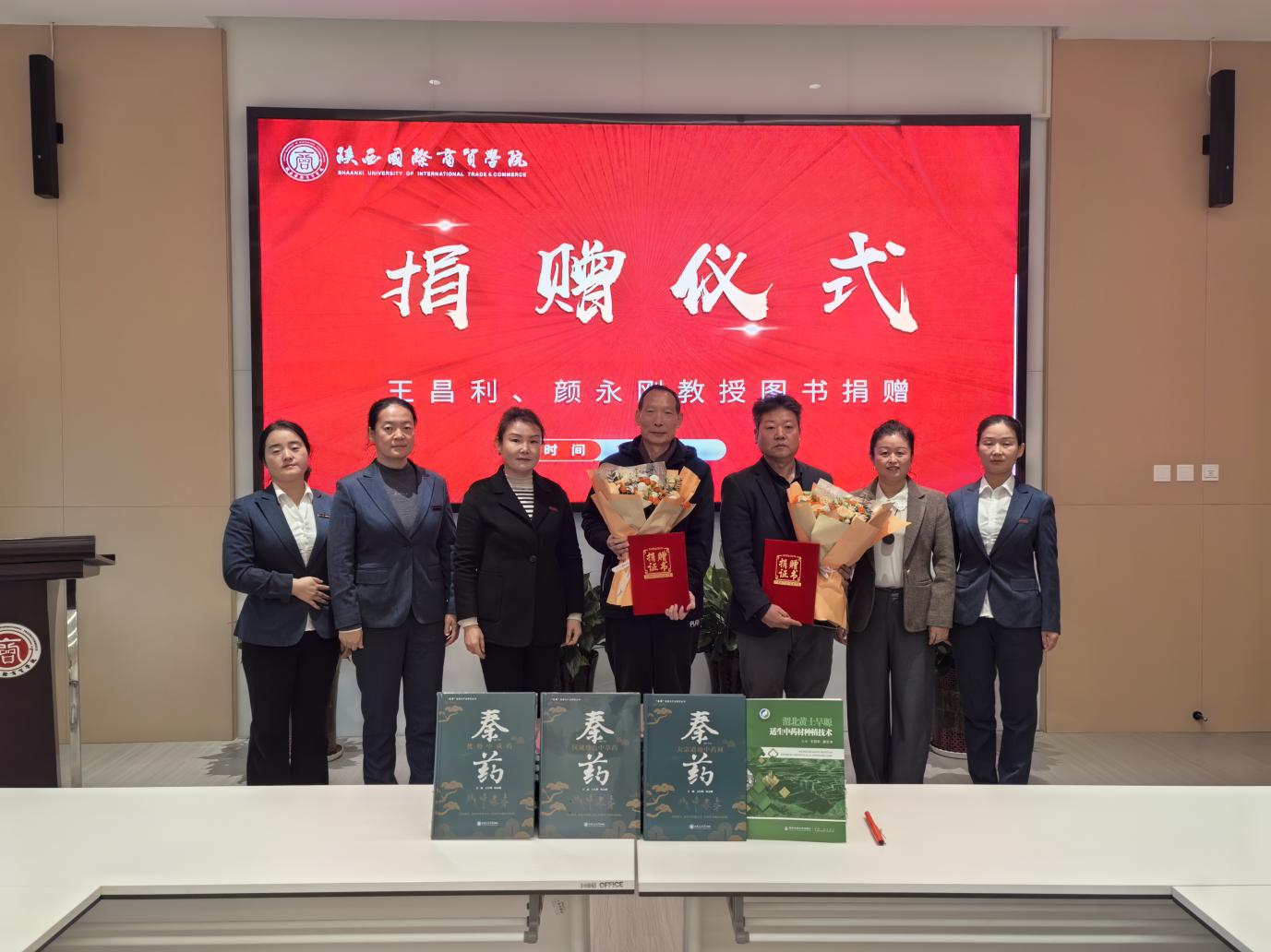 捐赠仪式上,图书馆领导班子代表学校接收了两位教授编著的《秦药:大宗道地中药材》《渭北黄土旱塬适生中药材种植技术》《秦药:区域特色中草药》及《秦药:优势中成药》等重要学术专著四十本,随后向两位教授颁发捐赠证书、赠送鲜花并表达诚挚谢意。